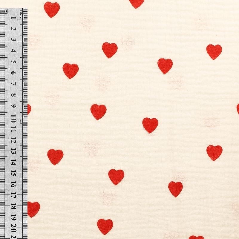 Apportez une touche de délicatesse à vos créations avec ce tissu en double gaze de coton orné d'un motif coeur rouge. Légère et aérienne, la double gaze est appréciée pour sa texture naturellement froissée et son incroyable douceur au toucher. Ce tissu est idéal pour des vêtements confortables comme des blouses, des robes ou des accessoires pour enfants, mais aussi pour de la décoration légère : coussins, langes ou plaids d’été.