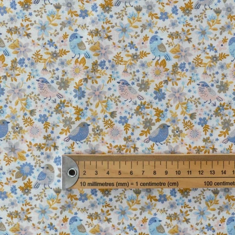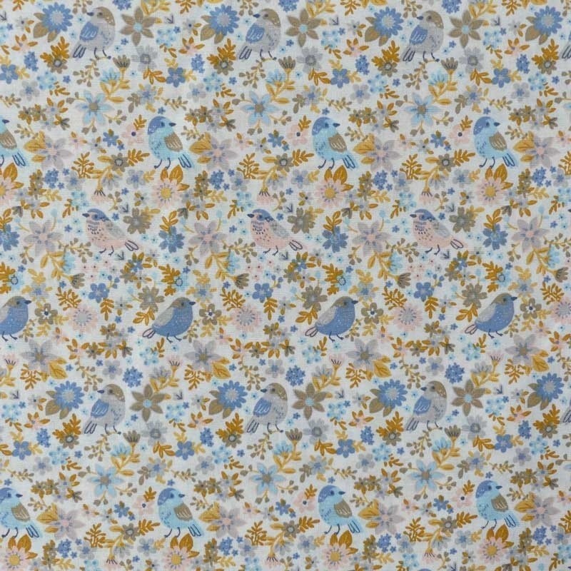 Le tissu Moineau ciel est imprimé d'un motif fleurs et oiseaux. Ce tissu 100% coton polyvalent pourra être utilisé aussi bien pour la confection d'accessoires déco que pour de l'habillement.