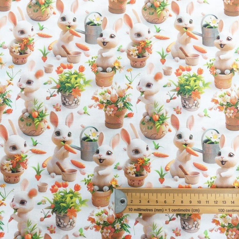 Apportez une note originale à vos créations grâce à ce tissu Pots à impression digitale, orné d'adorables lapins effet 3D sur un fond doux et lumineux. L'impression digitale permet une grande précision dans les détails, avec des couleurs nettes et des contrastes réalistes qui renforcent l'illusion de relief.