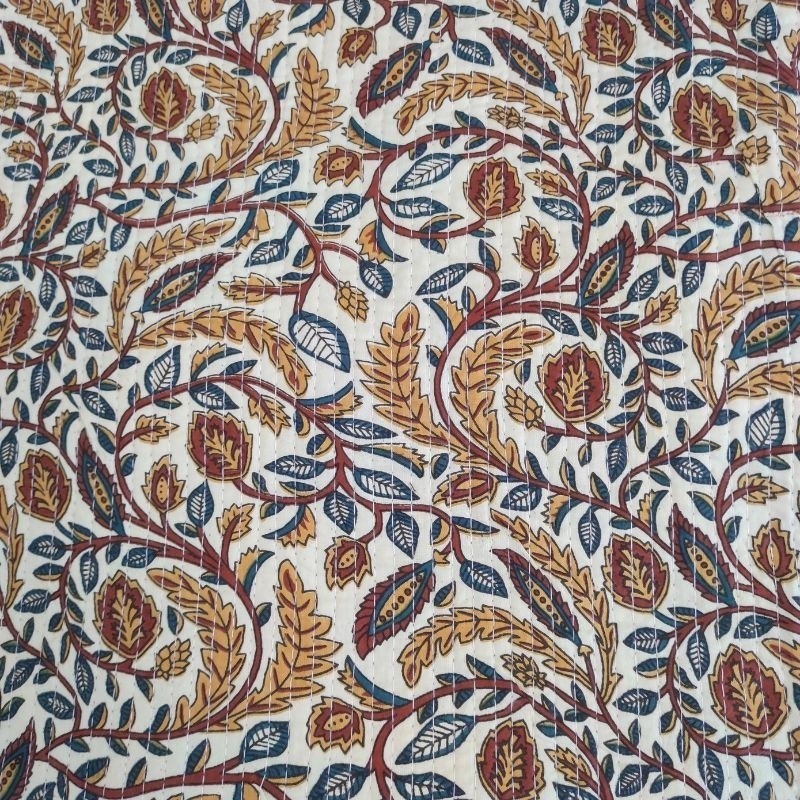 Découvrez ce tissu blockprint matelassé 100% coton double face, orné d'un magnifique motif floral et géométrique écru, doré et marron. Les motifs sont imprimés à la main avec des tampons.Ce matelassé apporte de l'authenticité et de l'élégance à vos projets de couture décoration intérieure, ou créations vestimentaires...
