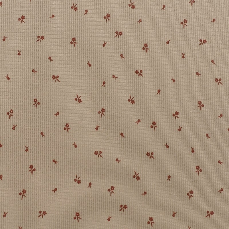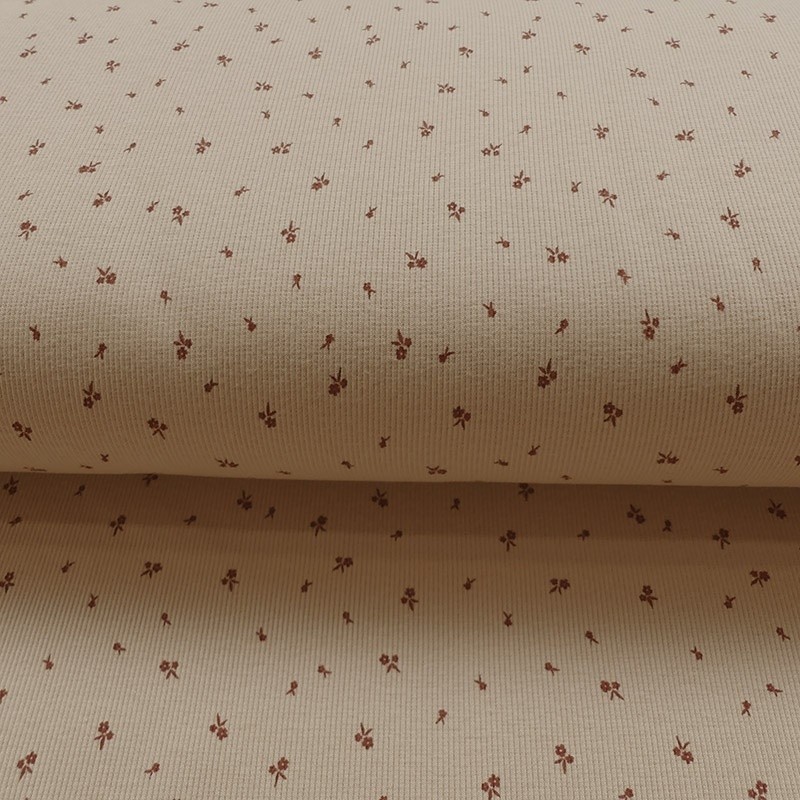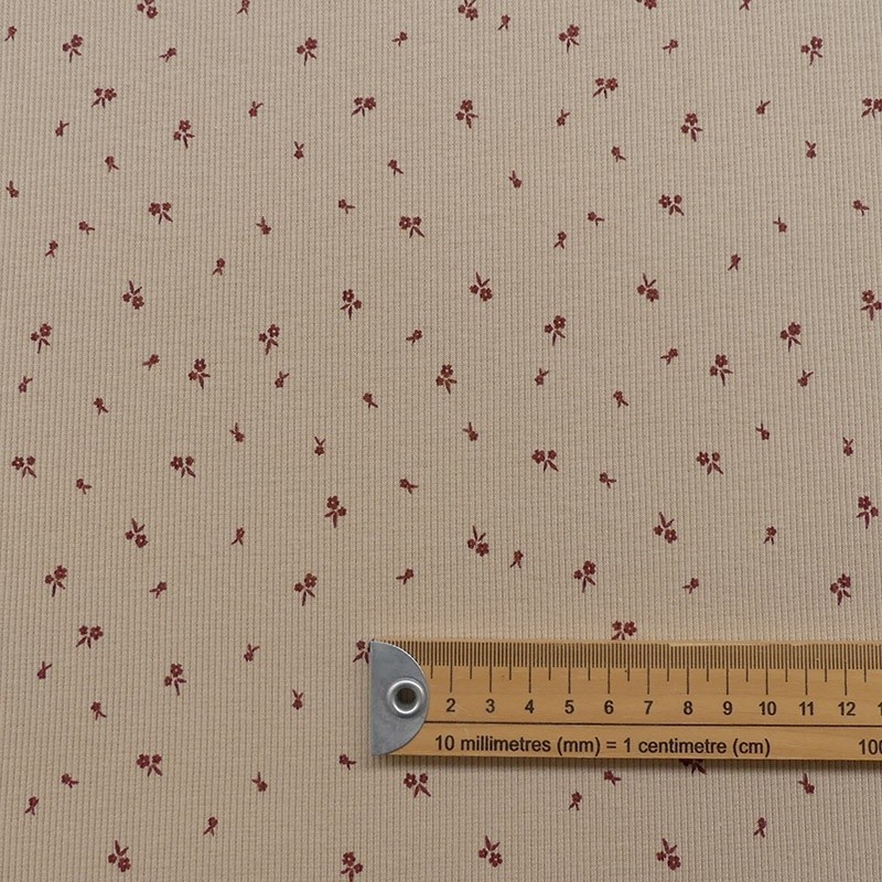 A la fois confortable et extensible le jersey côtelé petites fleurs sur fond beige conviendra pour toutes vos confections de vêtements comme des tee-shirts.