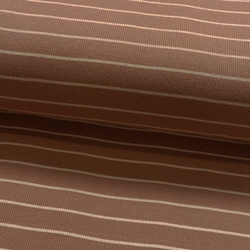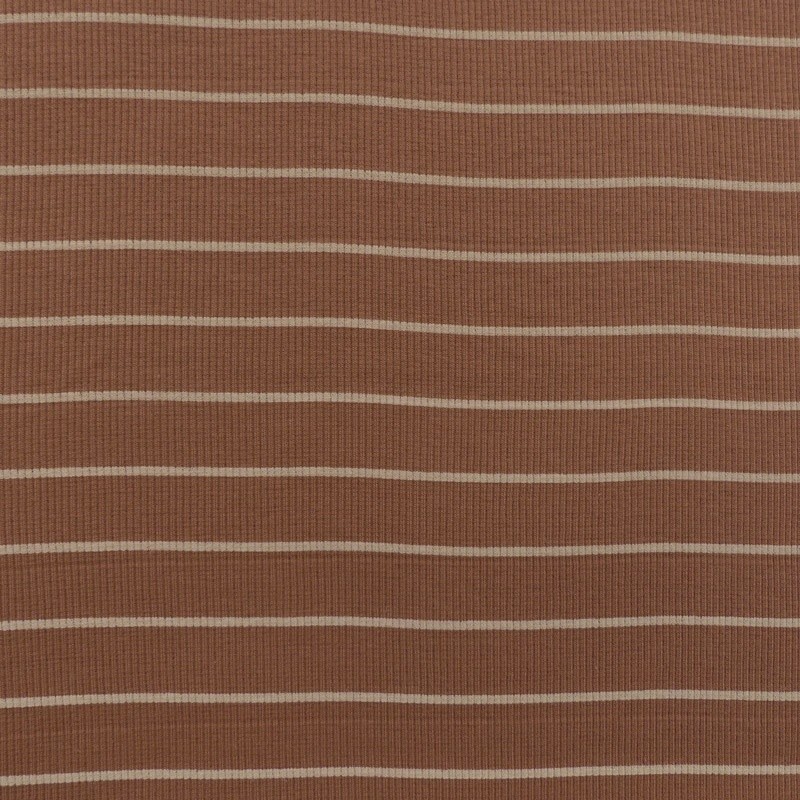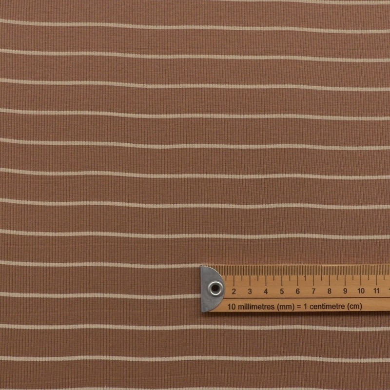 A la fois confortable et extensible le jersey côtelé rayé sur un fond camel conviendra pour toutes vos confections de vêtements comme des tee-shirts.