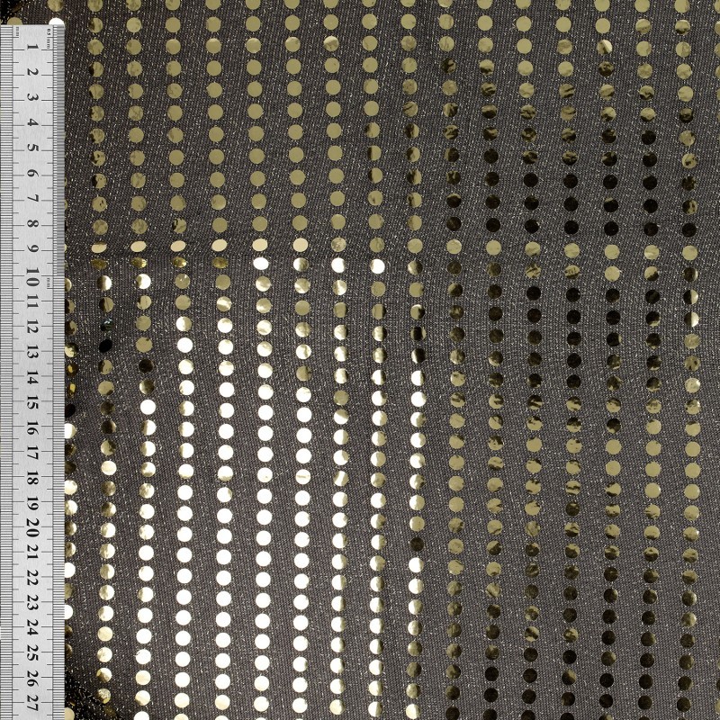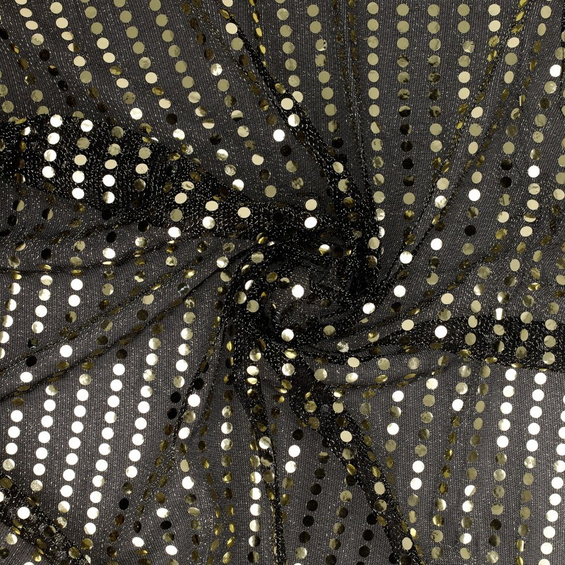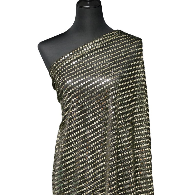 Offrez à vos créations une allure éclatante avec notre tissu paillettes dorées sur voile noir. Conçu sur un voile scintillant argent, ce tissu est entièrement rehaussé de paillettes parfaitement assorties à la couleur du support, créant un rendu harmonieux, homogène et irrésistiblement brillant.