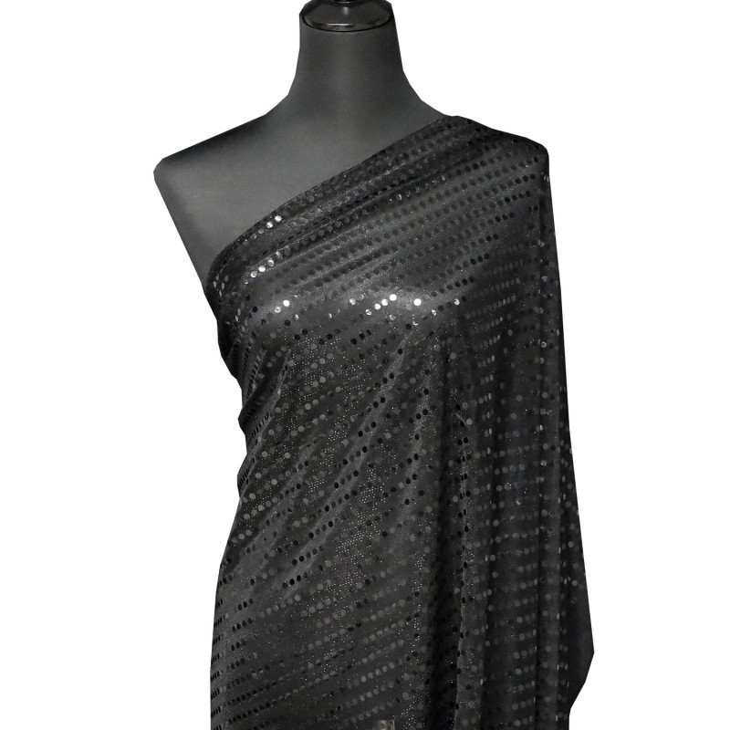 Offrez à vos créations une allure éclatante avec notre tissu paillettes sur voile noir. Conçu sur un voile scintillant argent, ce tissu est entièrement rehaussé de paillettes parfaitement assorties à la couleur du support, créant un rendu harmonieux, homogène et irrésistiblement brillant. La combinaison du voile léger, au mouvement fluide, et des paillettes noires ton sur ton est idéale pour sublimer la lumière. Parfait pour la réalisation de robes de soirée, tenues événementielles, costumes artistiques, accessoires glamour ou éléments décoratifs haut de gamme.