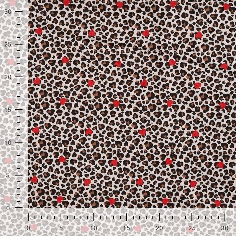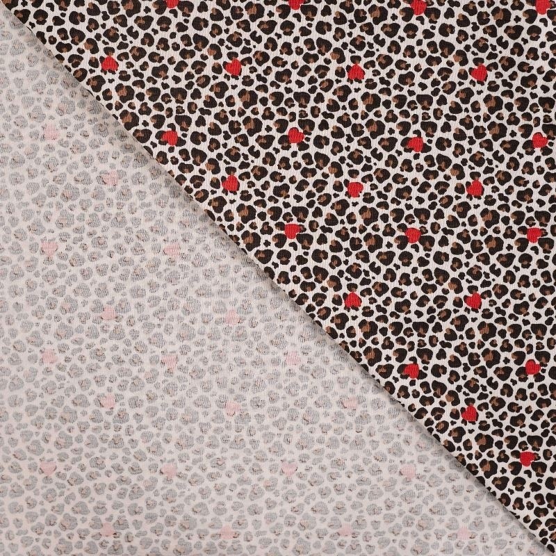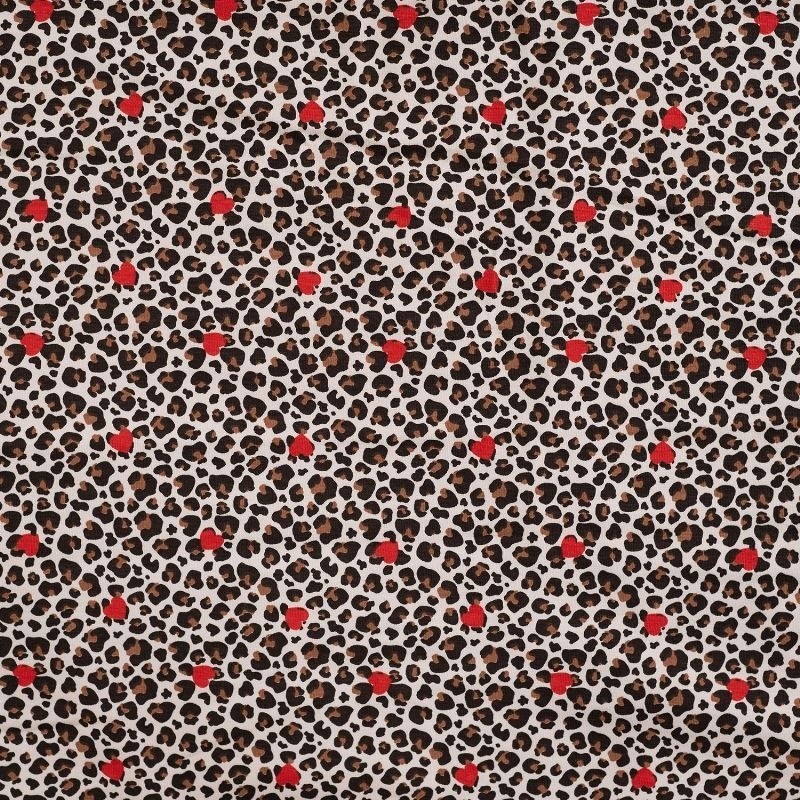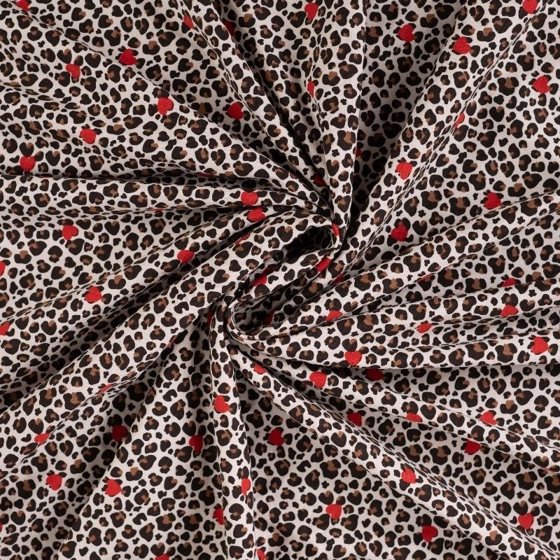 Ce tissu jersey de coton imprimé d'un motif coeur et léopard est un incontournable pour la confection de vêtements confortables et modernes. Composé de 95% coton et 5% élasthanne, il offre une excellente élasticité, une grande douceur au toucher et un très bon maintien. Avec son grammage de 200 g/m², ce jersey présente une belle tenue tout en restant souple et agréable à porter.