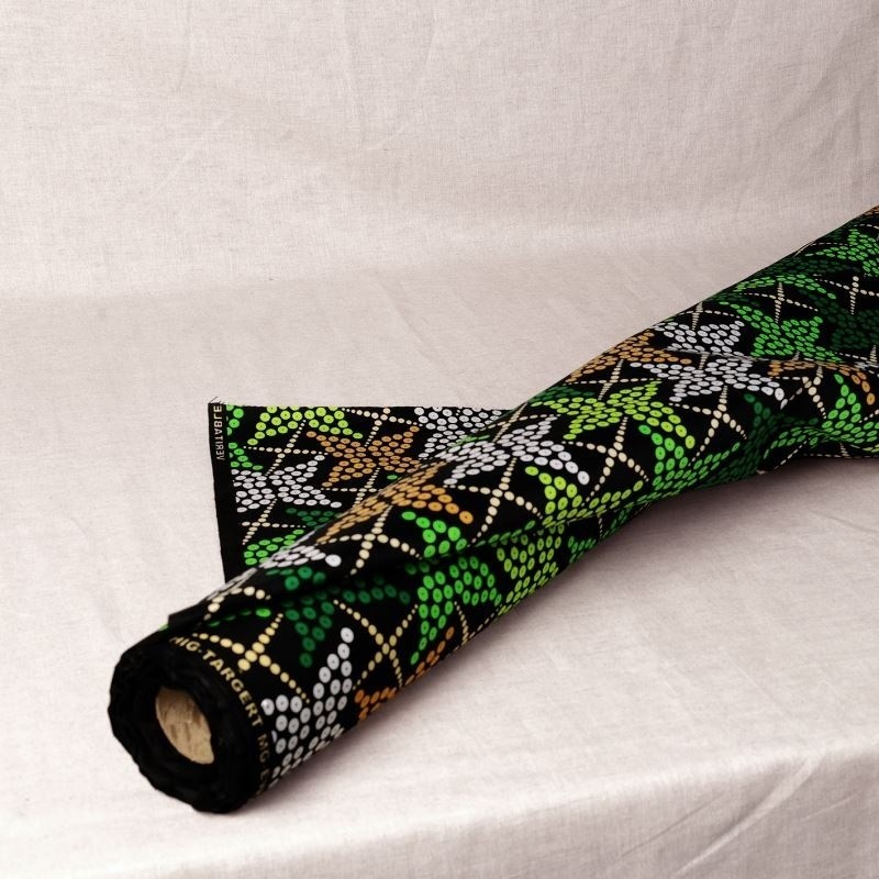 Le tissu Wax 100% polyester imprimé d'un motif étoile vert est idéal pour le vestimentaire ou en déco. Vous pouvez également utiliser ce tissu pour la confection de sacs ou de pochettes. On aime son toucher doux et sa belle tenue.