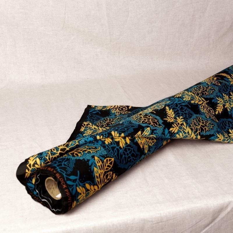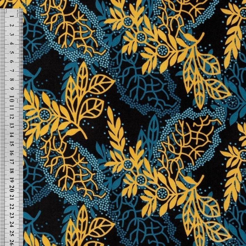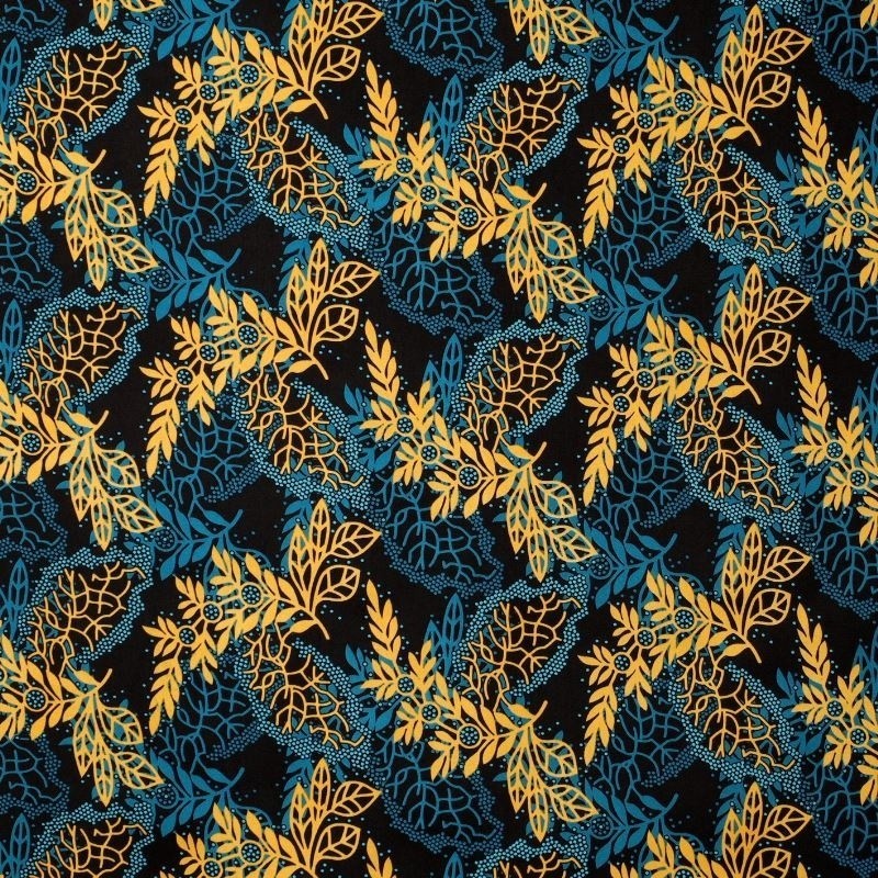 Le tissu Wax 100% polyester imprimé d'un motif feuille bleu et jaune est idéal pour le vestimentaire ou en déco. Vous pouvez également utiliser ce tissu pour la confection de sacs ou de pochettes. On aime son toucher doux et sa belle tenue.Info produit: impression double face