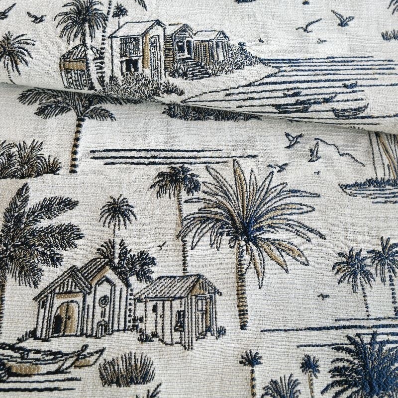 Ce tissu jacquard se distingue par son tissage texturé de qualité, qui met en relief chaque détail du décor maritime. Le bleu rappelle les horizons marins et s’associent facilement à une décoration naturelle, bord de mer ou contemporaine.