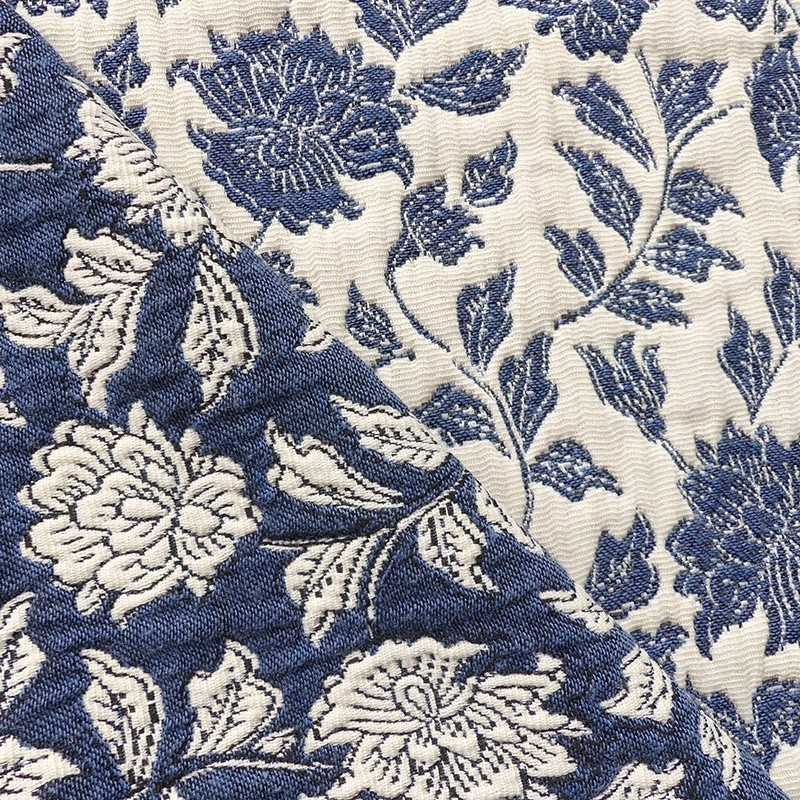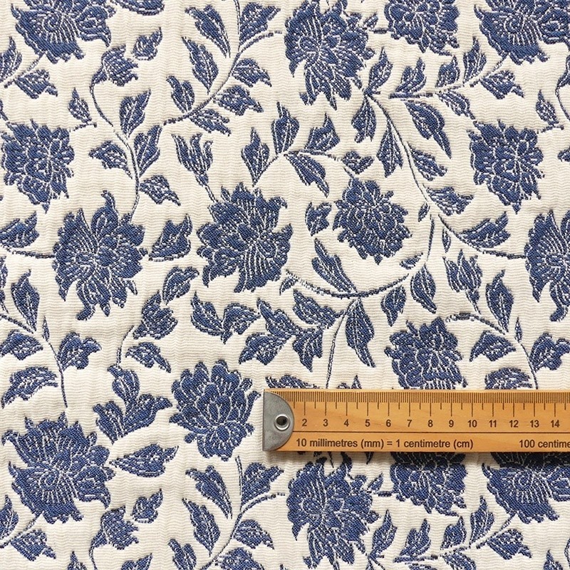 Le coloris bleu chaleureux apporte une touche de modernité à l’ensemble. Les fleurs, finement dessinées dans le tissage jacquard, offrent du relief et une belle profondeur visuelle.