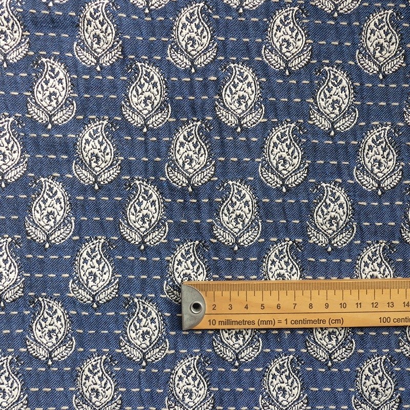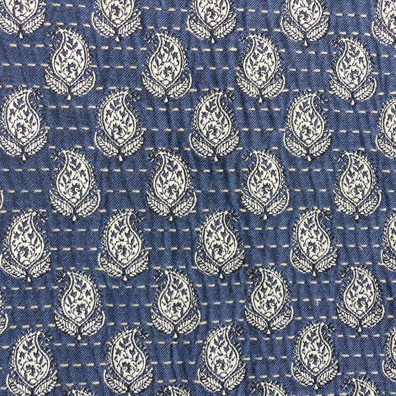 Le coloris jean apporte une touche de modernité à l’ensemble. Les fleurs, finement dessinées dans le tissage jacquard, offrent du relief et une belle profondeur visuelle, tandis que le fond en pointillé ajoute une dimension graphique discrète mais structurante.