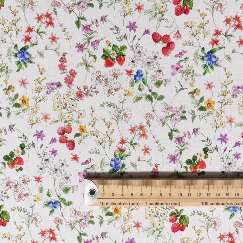 Apportez une touche de fraîcheur et de délicatesse à vos créations avec ce tissu Berries en pur coton, orné d’un élégant motif fruit imprimé sur fond blanc.