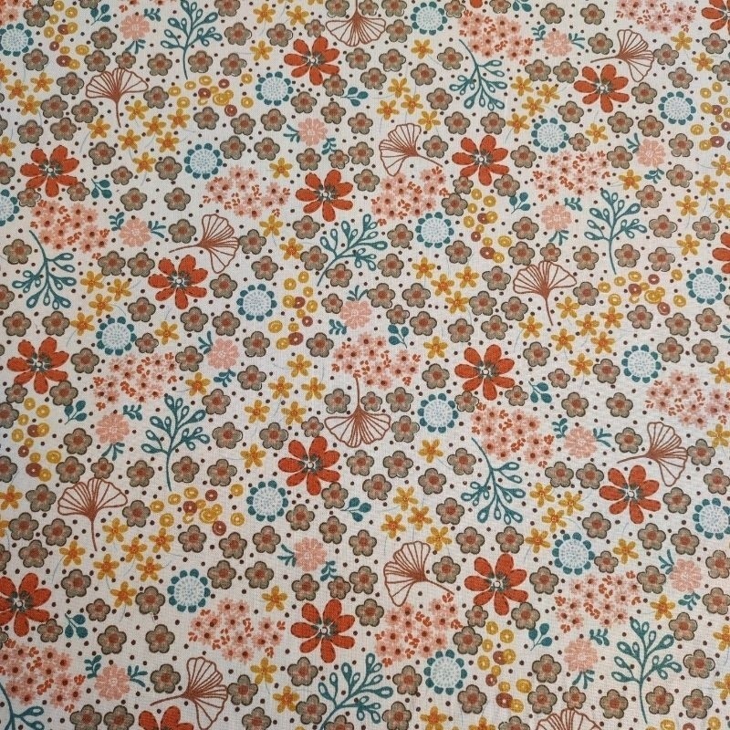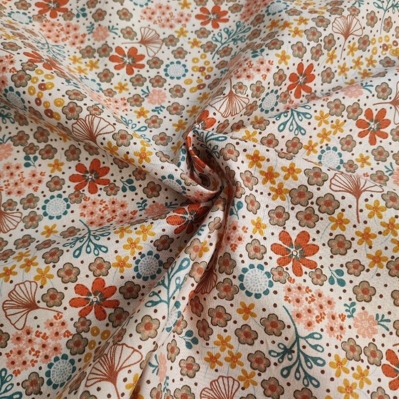 Ce tissu popeline Asaka 100% coton imprimé d'un motif floral orange et jaune est à la fluide et souple, il conviendra parfaitement pour la réalisation d'accessoire déco.