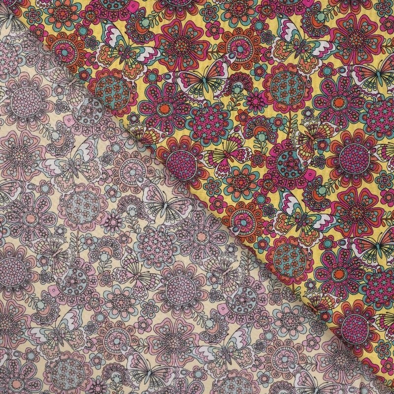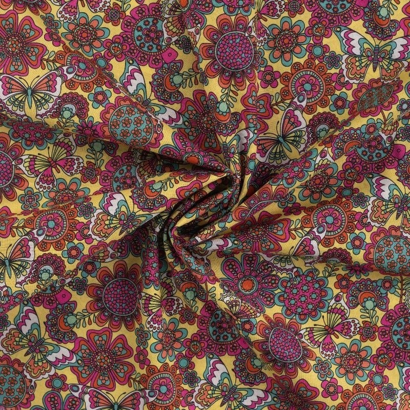Le voile de coton est une matière agréable à porter car elle est douce et légère. Ce tissu imprimé papillon jaune peut-être utilisé pour la confection de vêtements légers comme des chemisiers ou pour des robes à doubler.