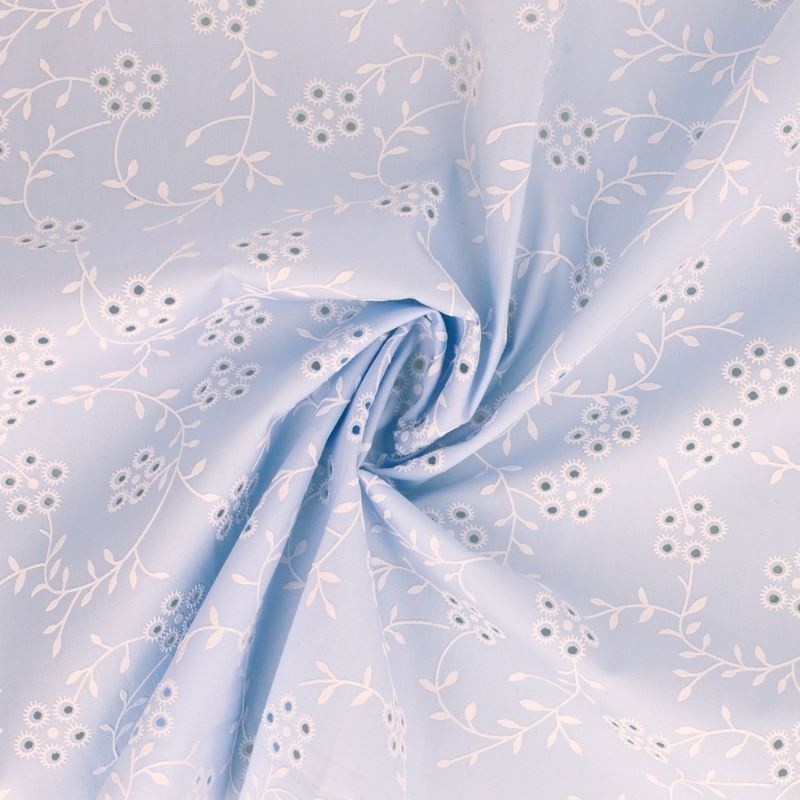 Tissu Popeline Floquée Esprit Broderie Bleu Ciel
