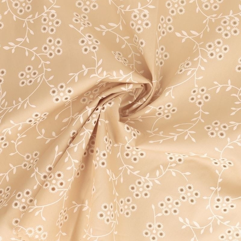 Apportez une touche de délicatesse et d’élégance à vos créations avec ce magnifique tissu en popeline 100% coton floqué beige, inspiré de l’esthétique raffinée de la broderie anglaise.