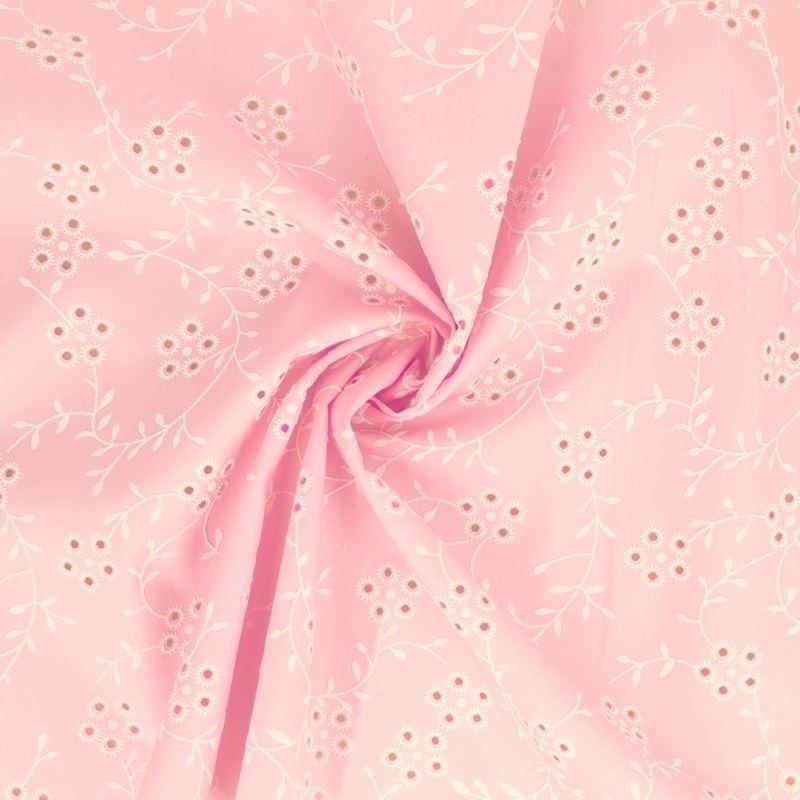 Apportez une touche de délicatesse et d’élégance à vos créations avec ce magnifique tissu en popeline 100% coton floqué rose, inspiré de l’esthétique raffinée de la broderie anglaise.